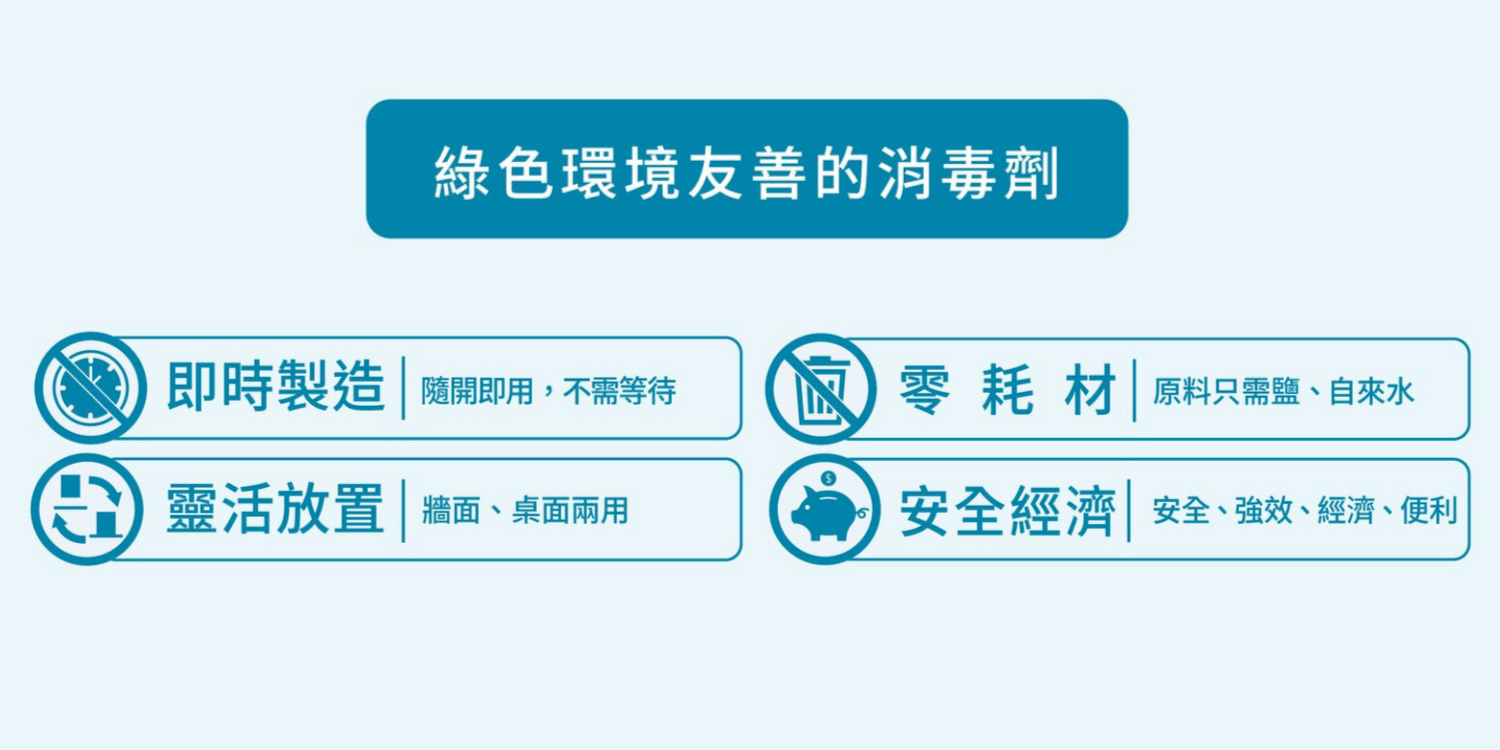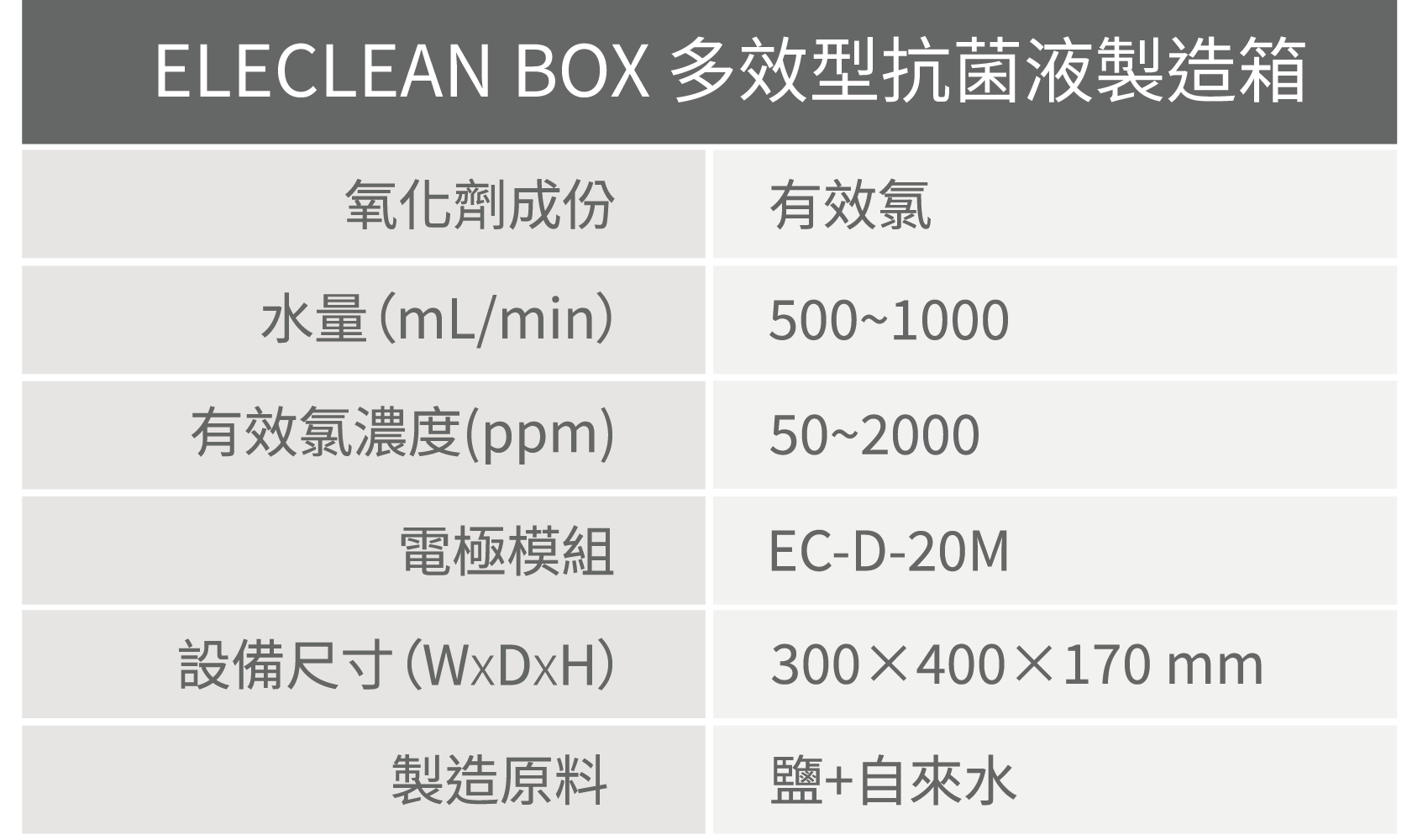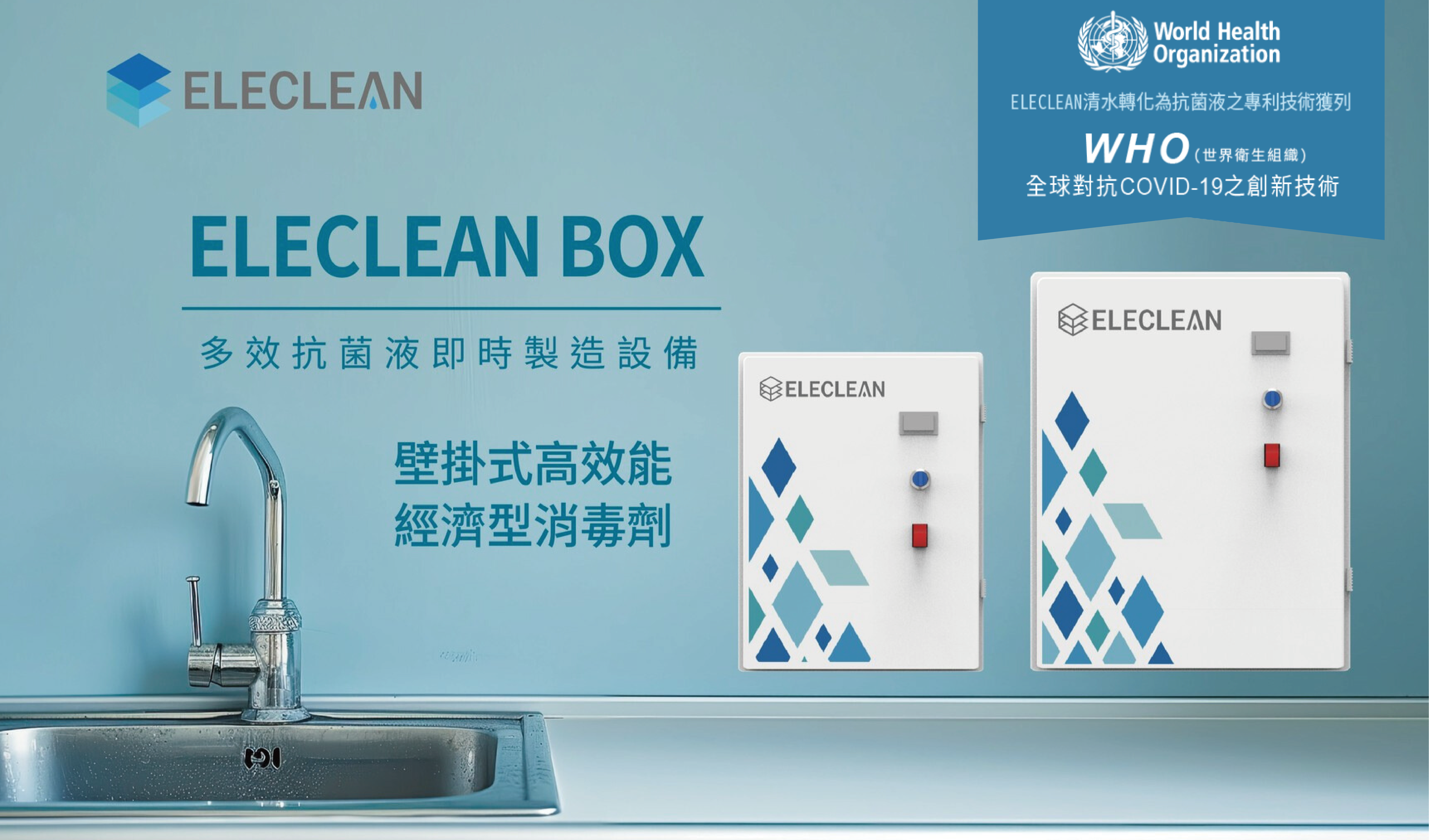 ELECLEAN BOX 多效消毒水製造機以強氧化方式破壞細菌及病毒,使其失去活性,具高效殺菌效果、環境友善無危害及操作便利等優點。
